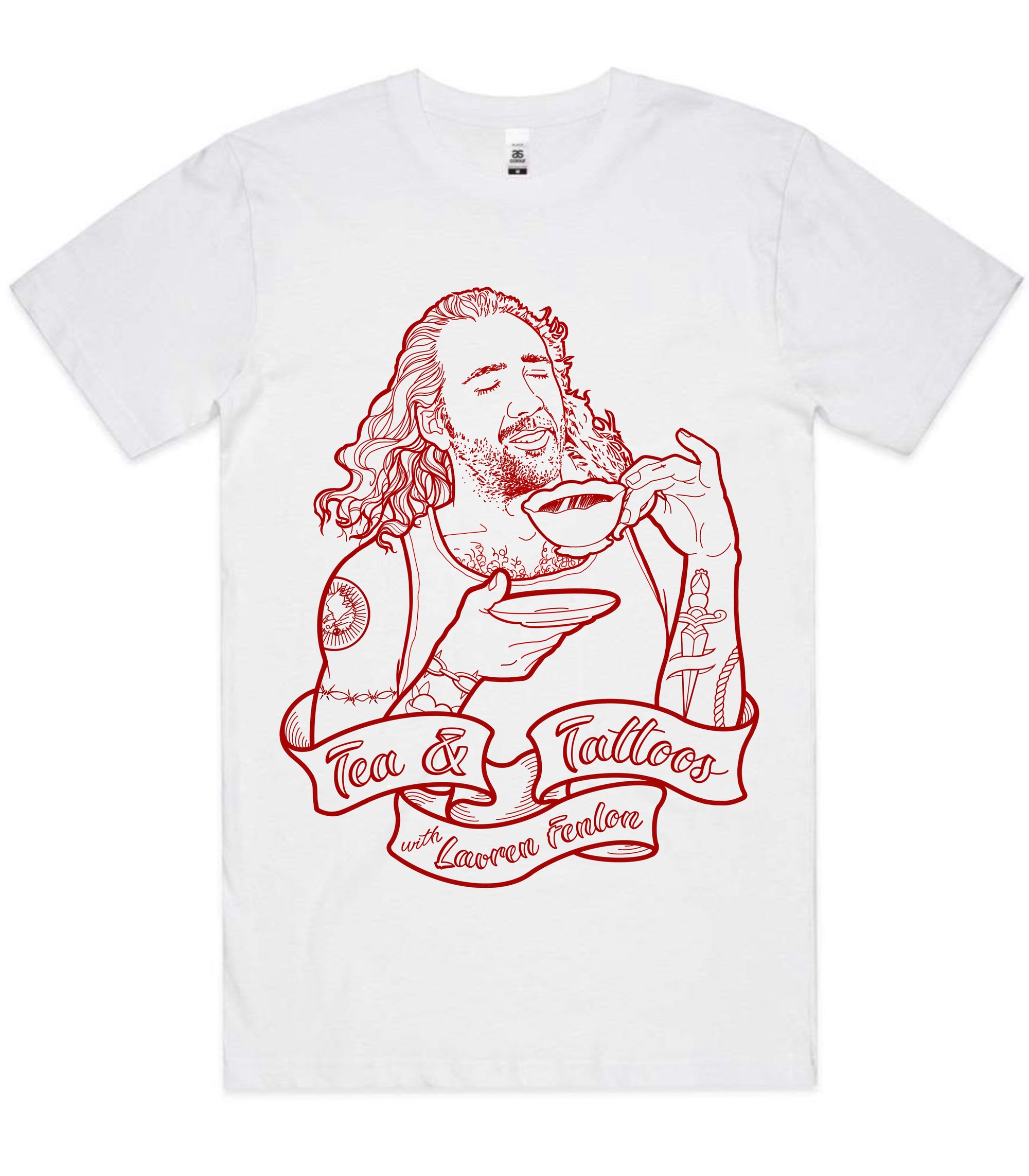 100% cotton. Screen printed on White AS COLOUR Staple t-shirt.